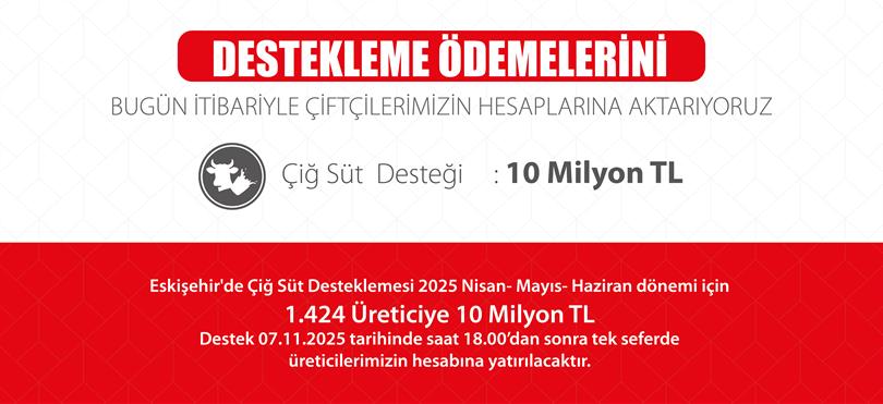 Eskişehir'de Çiğ Süt Desteklemesi 2025 Nisan- Mayıs- Haziran dönemi için 1.424 Üreticiye 10 Milyon TL destek 07.11.2025 tarihinde saat 18.00 dan sonra tek seferde üreticilerimizin hesabına yatırılacaktır.