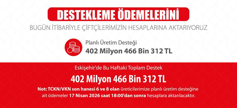 TCKN/VKN son hanesi 6 ve 8 olan üreticilerimize planlı üretim desteğine ait ödemeler 17 Nisan 2026 saat 18:00'dan sonra hesaplara aktarılacaktır.